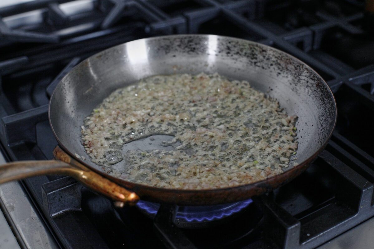 3. While the pasta cooks, heat the butter in a large pan over medium heat. Sauté the shallot for 3 minutes, until soft and translucent.