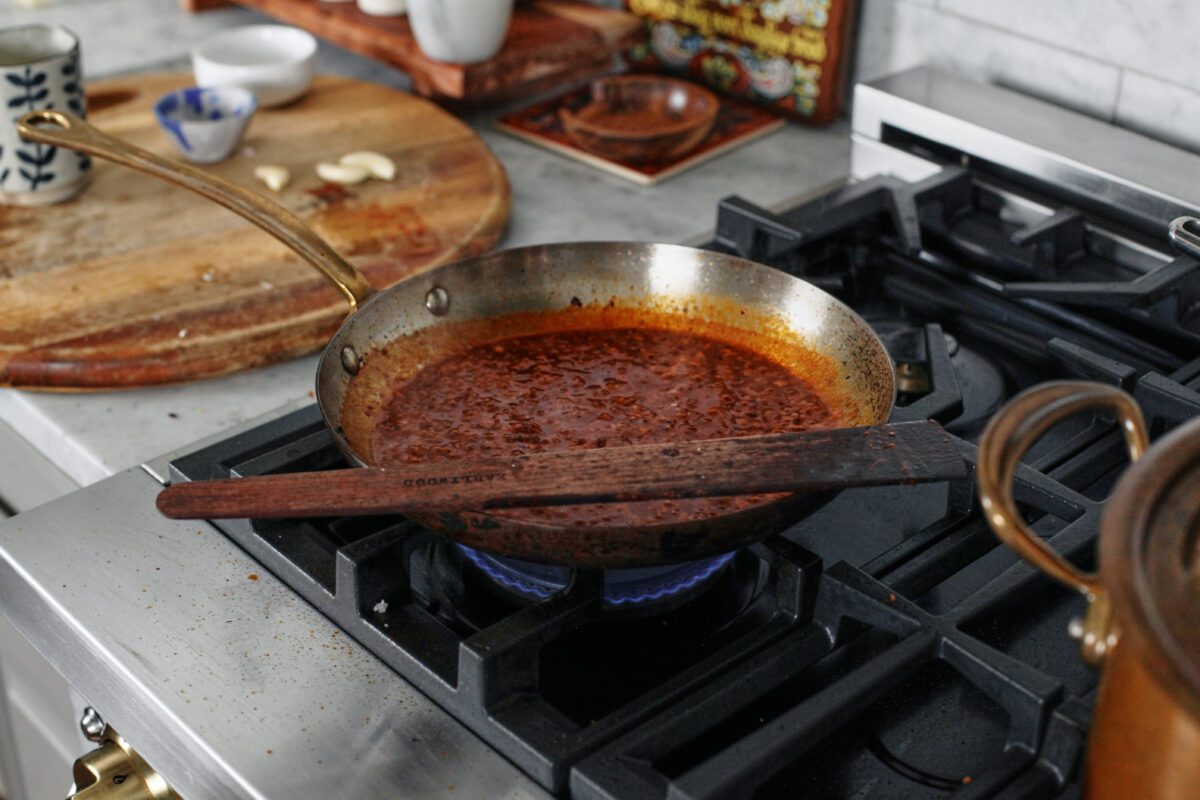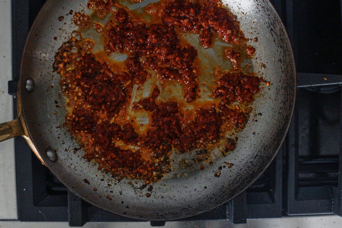Stir in the tomato paste and let it cook for about 5 minutes, stirring occasionally, until it deepens in colour and becomes slightly caramelized.