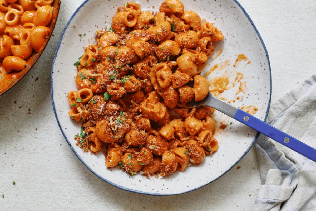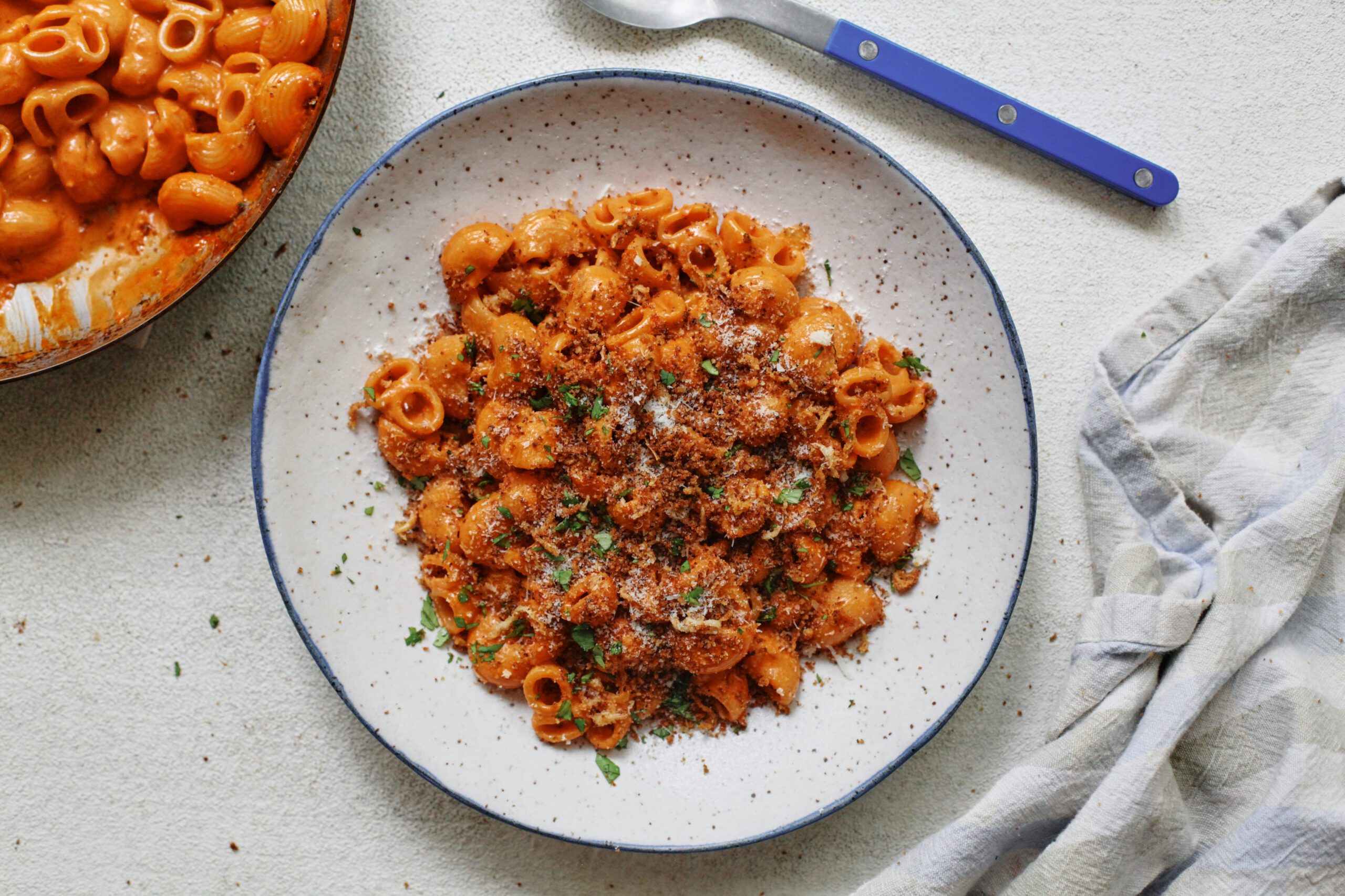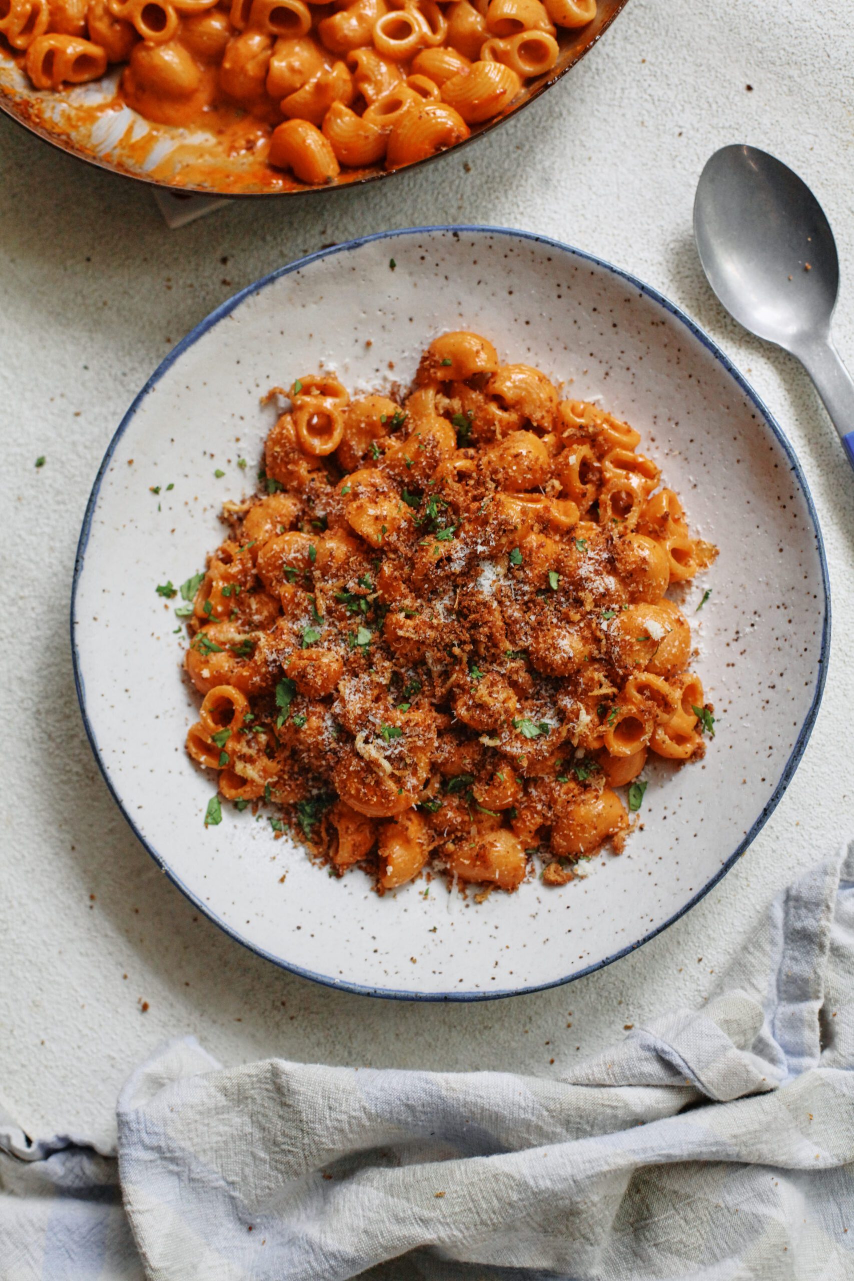 A creamy, weeknight-ready vodka pasta finished with crispy, garlicky parmesan breadcrumbs.