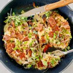 Assemble: roasted cauliflower steaks, drizzle with cheesy sauce, top with crumbled bacon, chives and microgreens (optional).