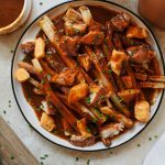 Assemble: fries on the bottom, lobster meat chunks, cheese curds, lobster gravy poured on top and finish with chives!